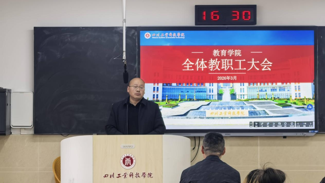 3月19日,教育学院在龑江D404教室召开全体教职工大会。学院院长蔡林、副院长熊清明分别就近期重点工作作出部署,全院教职工参加会议。