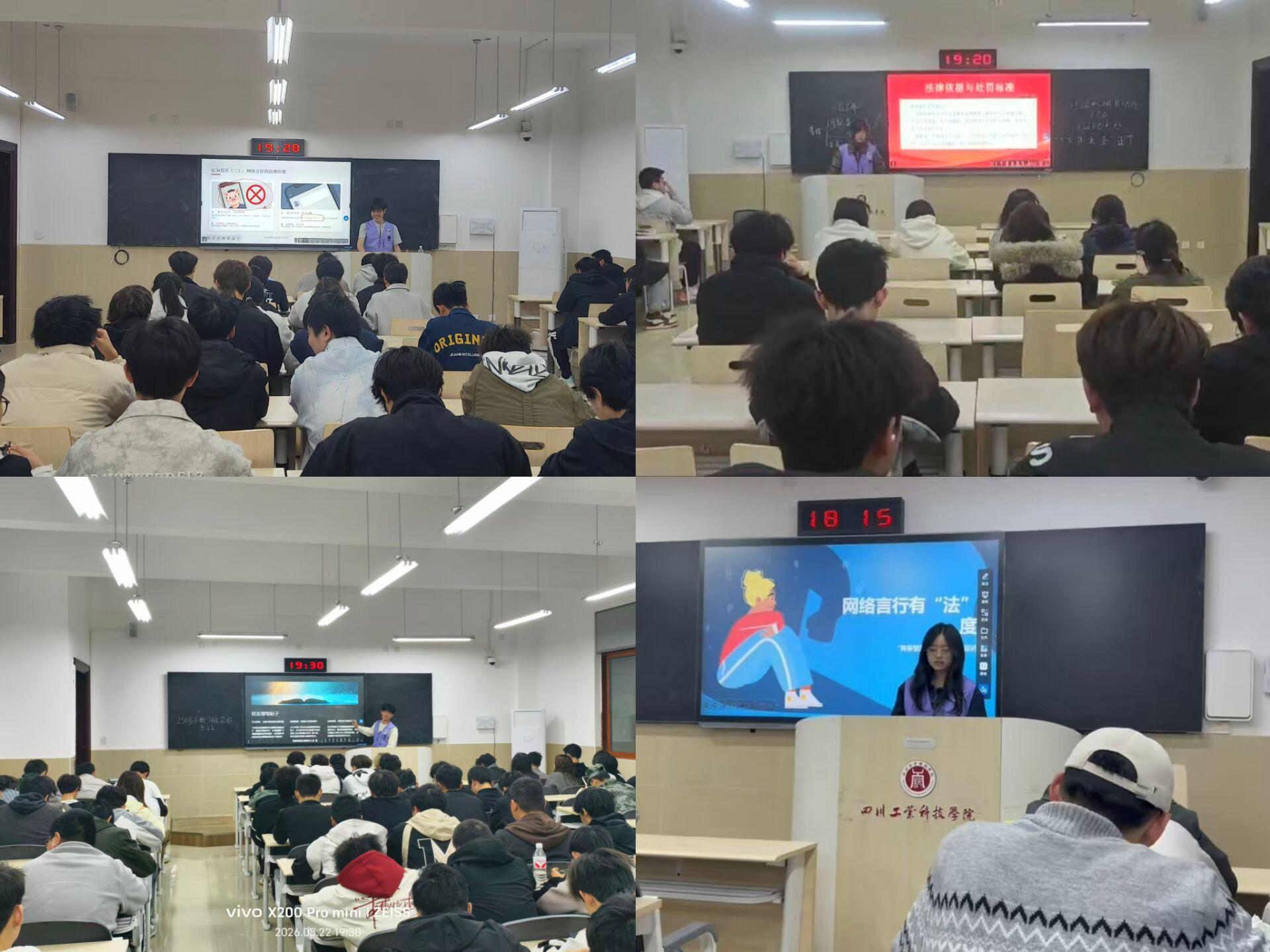 为切实增强大学生法治观念,营造尊法学法守法用法的校园文化氛围,3月22日,学校“青春警翼”志愿小队走进各学院班会课堂,开展“网络言行守规矩,法治底线记心间”主题法治宣讲活动,为同学们带来一堂生动的网络法治教育课。