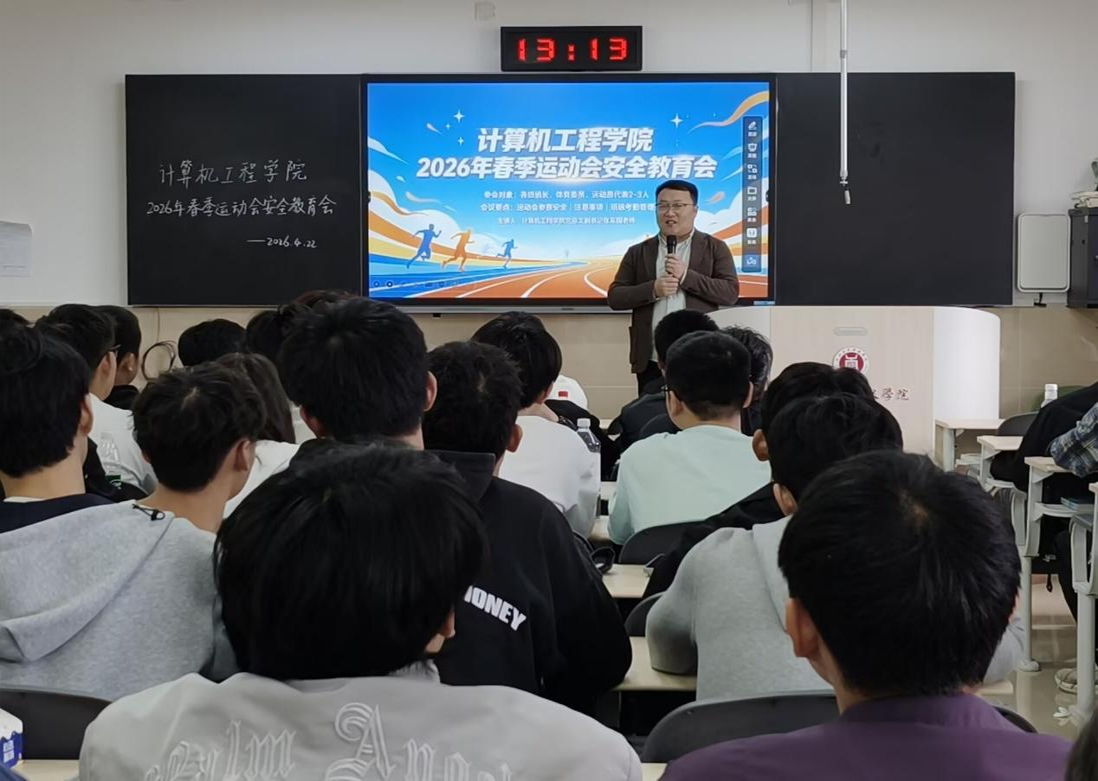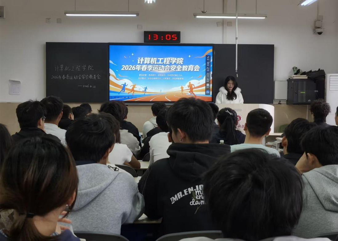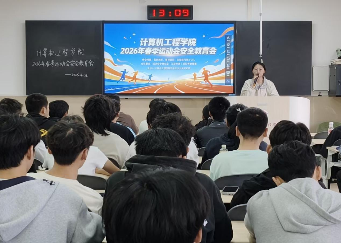为强化安全意识、涵养文明赛场风尚,保障2026年春季运动会安全、有序、文明开展,计算机工程学院于4月22日在龑江D305教室召开春季运动会安全教育会。学院党总支副书记张东国、团总支书记吴宇以及各班班长、体育委员和运动员代表参加会议。