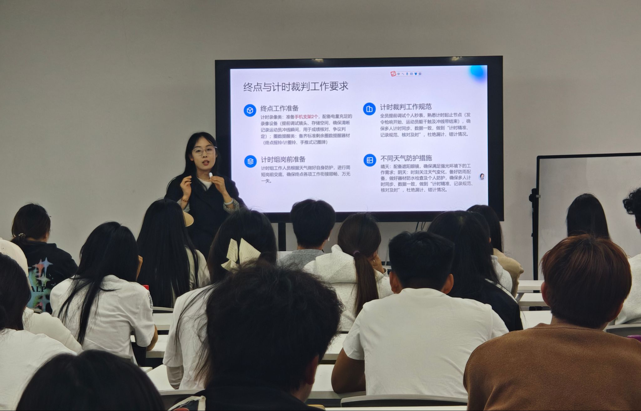 培训过程中,陈心歌围绕田赛与径赛两大项目的裁判工作要点进行了系统讲解,内容涵盖径赛终点计时、田赛成绩丈量等核心流程的专业规范,以及突发状况处置、特殊天气应对、赛事争议处理等关键环节的工作要求。参训学生裁判认真听讲、细致记录,展现了严谨务实的专业态度。