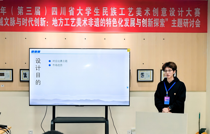 本次大赛校赛阶段由信息工程学院非遗文化创新与品牌设计研究中心组织承办,共征集作品160余件,经遴选推荐65件参加省赛。经评审,7件作品入围决赛答辩环节。赛事期间,学校师生积极参与“非遗活态展示与体验活动”,在羌绣代表性传承人林福美指导下现场体验传统针法技艺,聆听王宛奕博士“川西北非遗创新发展研究”专题讲座,并参与民族工艺美术传承与创新主题研讨。康欣老师结合教学与创作实践,在研讨中作了交流发言。