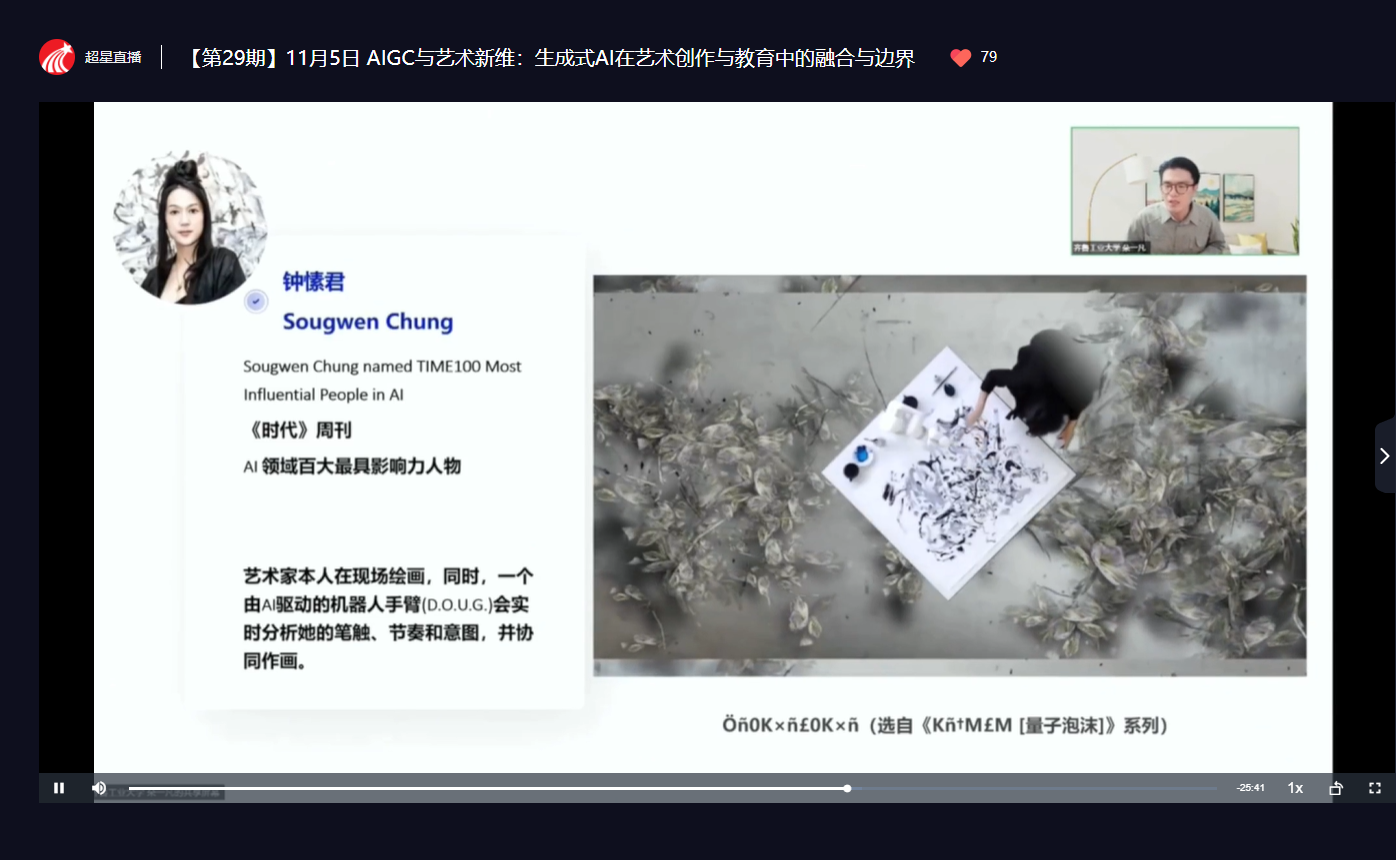 讲座重点探讨了AIGC技术如何赋能艺术教育创新。朵一凡表示,生成式AI不仅能拓展创作思维、激发艺术灵感,为教学提供丰富的辅助素材,更能催生互动式、个性化的新型教学模式。同时,她也冷静审视了技术应用过程中的伦理规范、版权界定以及人文精神守护等关键问题,引导教师们思考如何在拥抱技术的同时,明晰其应用的边界,确保科技为艺术教育健康发展服务。
