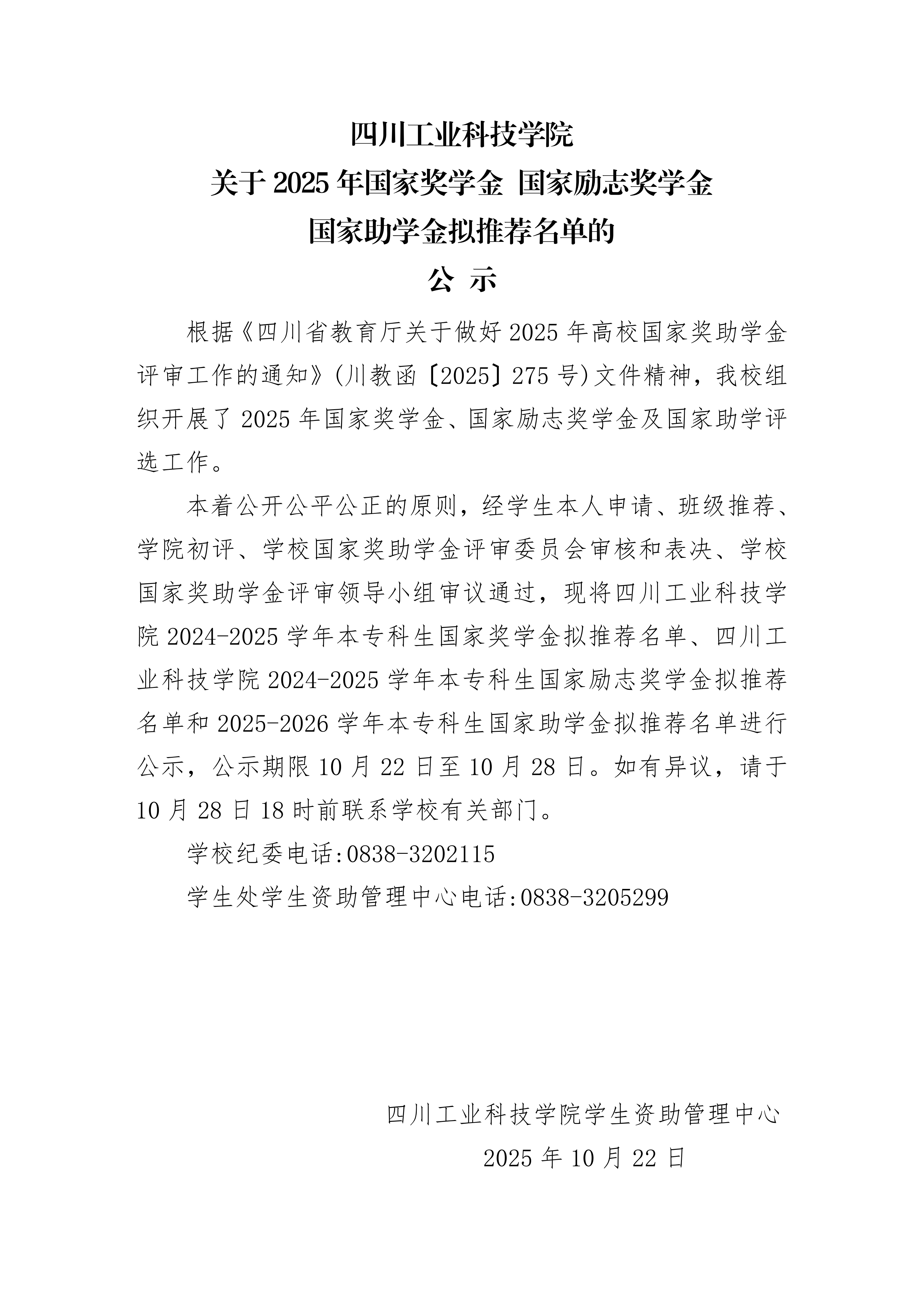 四川工业科技学院关于2025年国家奖学金 国家励志奖学金 国家助学金拟推选名单的公示