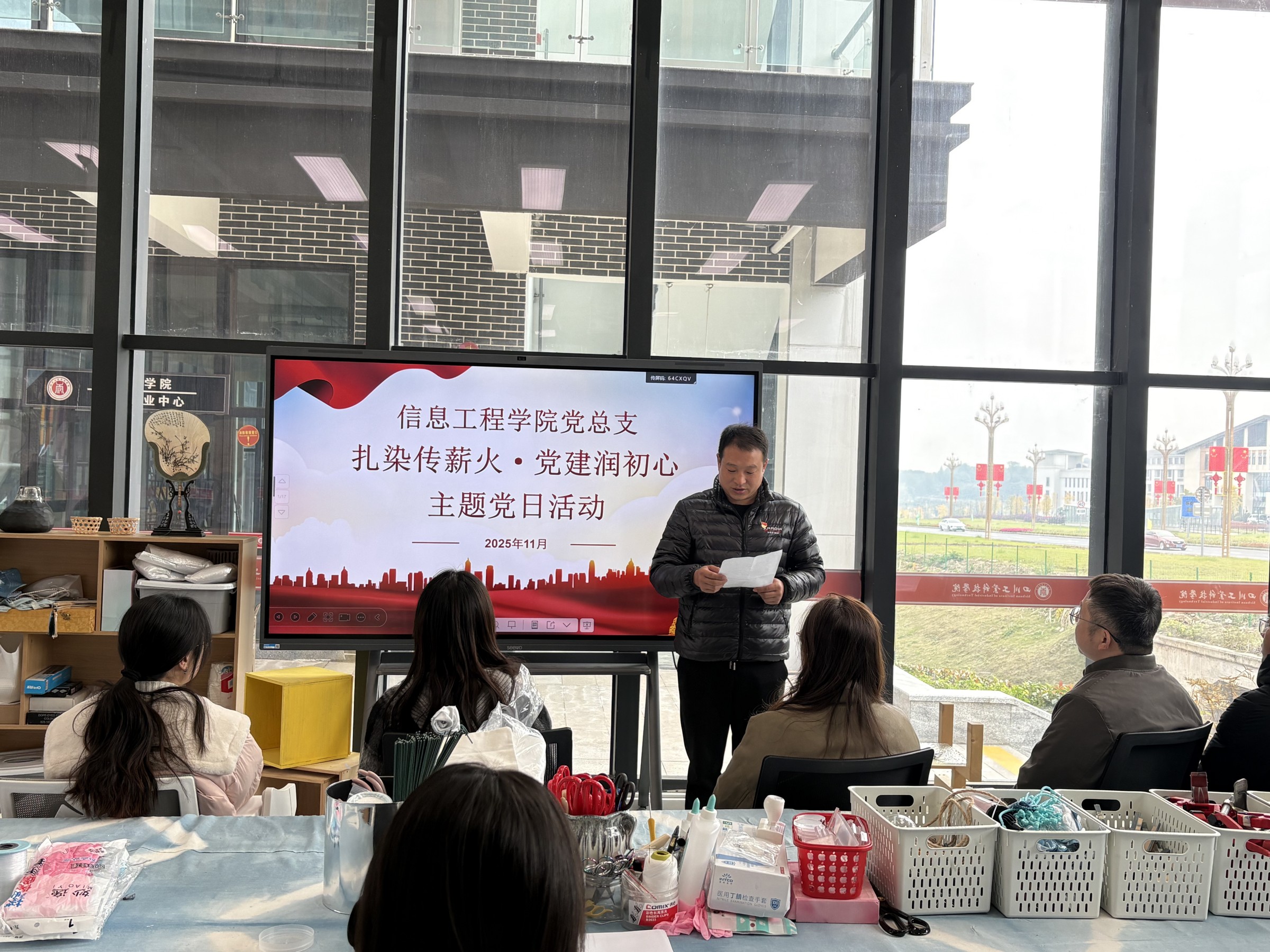 为创新党建工作载体,深化党性教育内涵,11月27日,信息工程学院党总支在创新创业中心组织开展“扎染传薪火·党建润初心”主题党日活动。活动将非物质文化遗产扎染技艺体验与党性教育相结合,学院党总支委员、各支部书记及师生党员代表20余人参与,在实践体验中感悟工匠精神,砥砺初心使命。