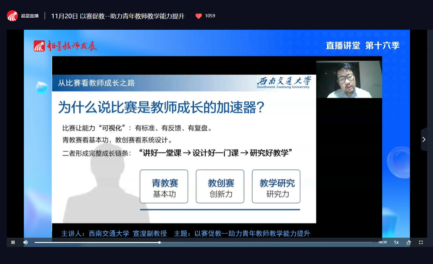 11月20日下午,学校教师教学发展中心精心组织全校无课教师,共同参加了超星教师发展直播讲堂第十六季第九期线上直播讲座。