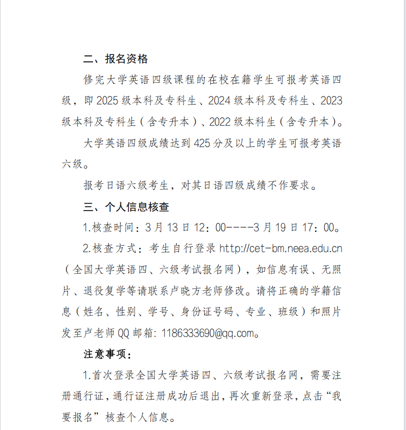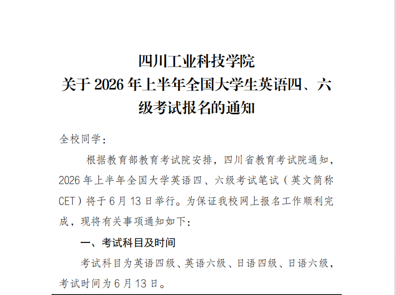 四川工业科技学院关于2026年上半年全国大学生英语四、六级考试报名的通知