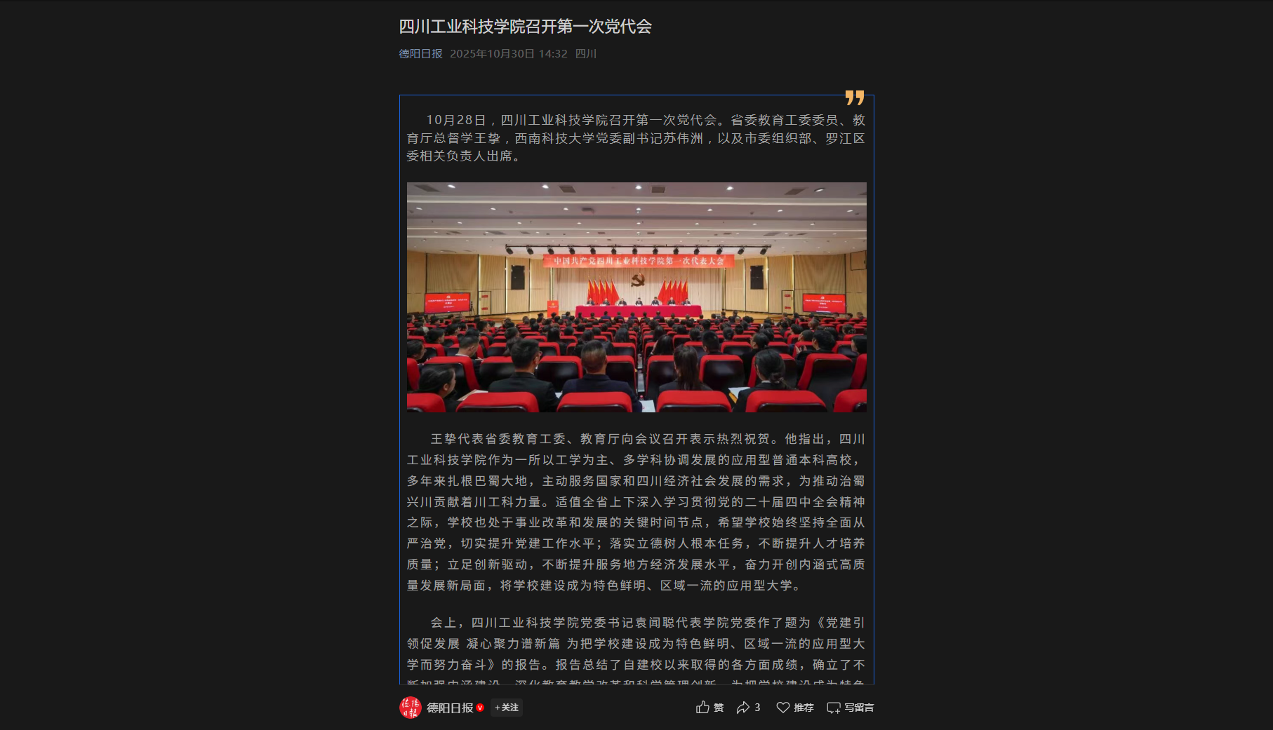 【德阳日报】四川工业科技学院召开第一次党代会