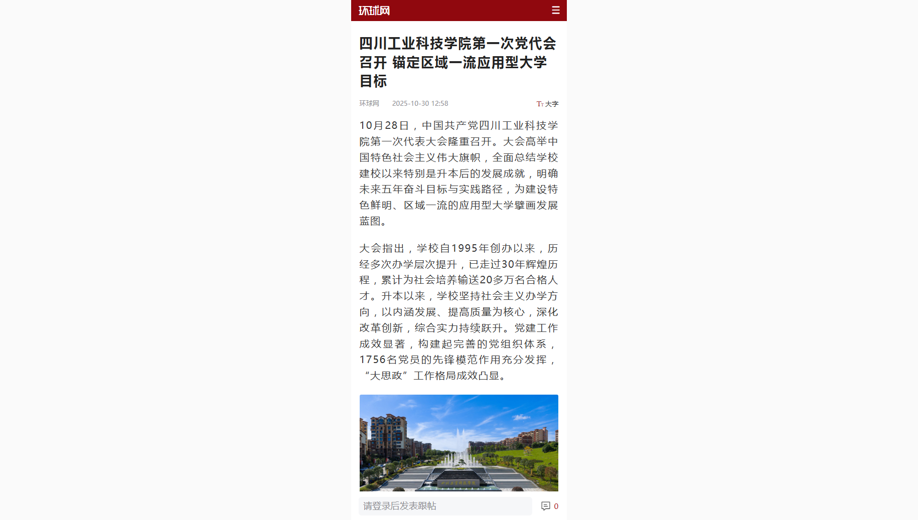 【环球网】四川工业科技学院第一次党代会召开 锚定区域一流应用型大学目标