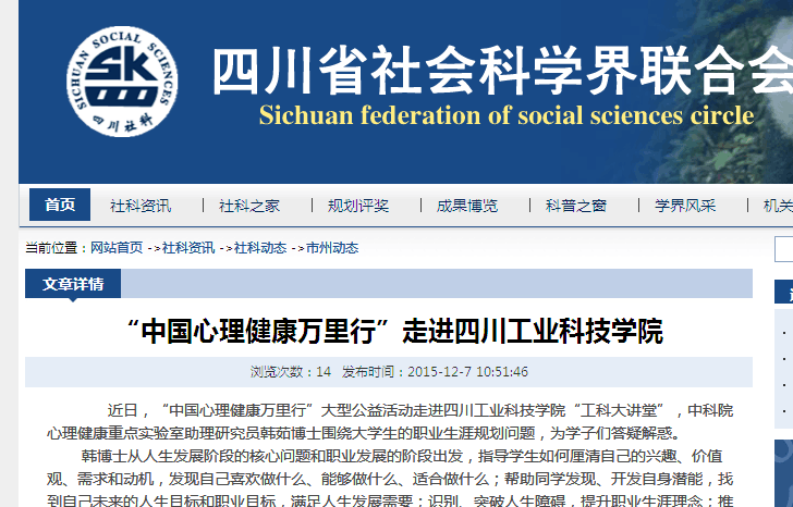 近日,“中国心理健康万里行”大型公益活动走进四川工业科技学院“工科大讲堂”,中科院心理健康重点实验室助理研究员韩茹博士围绕大学生的职业生涯规划问题,为学子们答疑解惑。 韩博士从人生发展阶段的核心问题和职业发展的阶段出发,指导学生如何厘清自己的兴趣、价值观、需求和动机,发现自己喜欢做什么、能够做什么、适合做什么;帮助同学发现、开发自身潜能,找到自己未来的人生目标和职业目标,满足人生发展需要;识别、突破人生障碍,提升职业生涯理念;推动、完成自我实现,争取实现人生的自我超越。广大学生受益匪浅。