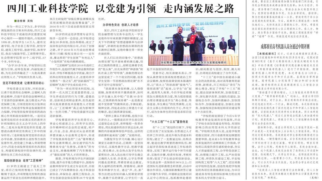 “《规划》描绘了今后五年学校教育事业发展的宏伟蓝图,开启了学校全面加快建设有特色、有国际影响力的应用型本科大学的新征程。”学校相关负责人说,这是学校贯彻落实国家、四川省教育规划纲要的重要举措,是未来五年学校教育事业改革发展的行动纲领和工作指南,学校将以高度的责任感和使命感,夯实人才质量提高工程、办学特色创新工程、治理能力提升工程、从严治党保障工程、师资队伍建设工程、平安校园构筑工程等“六大工程”,切实将推动学校特色发展,创造性地把《规划》各项任务措施落到实处,为早日建成具有特色和国际影响力的应用型本科大学而努力奋斗。(涂桂香 吴钩)