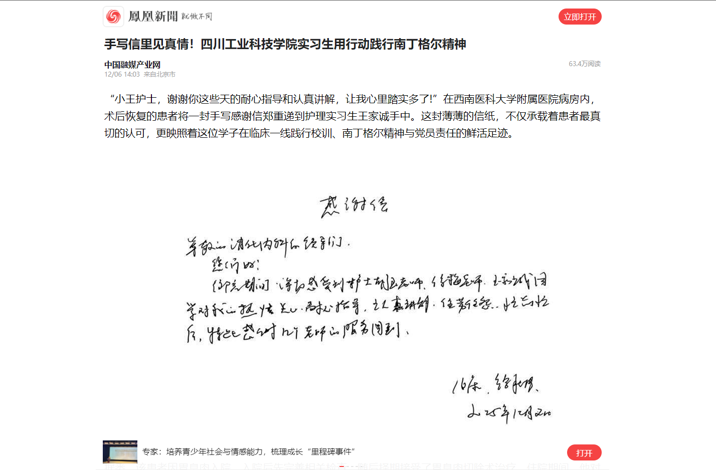“小王护士,谢谢你这些天的耐心指导和认真讲解,让我心里踏实多了!”在西南医科大学附属医院病房内,术后恢复的患者将一封手写感谢信郑重递到护理实习生王家诚手中。这封薄薄的信纸,不仅承载着患者最真切的认可,更映照着这位学子在临床一线践行校训、南丁格尔精神与党员责任的鲜活足迹。