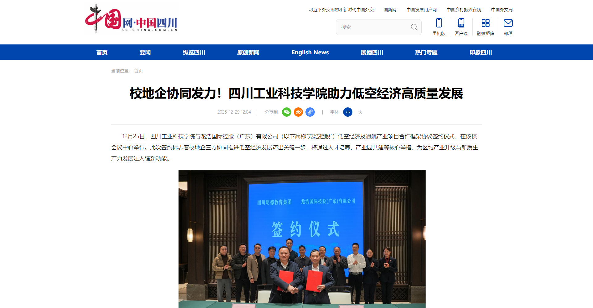 12月25日,四川工业科技学院与龙浩国际控股(广东)有限公司(以下简称“龙浩控股”)低空经济及通航产业项目合作框架协议签约仪式,在该校会议中心举行。此次签约标志着校地企三方协同推进低空经济发展迈出关键一步,将通过人才培养、产业园共建等核心举措,为区域产业升级与新质生产力发展注入强劲动能。