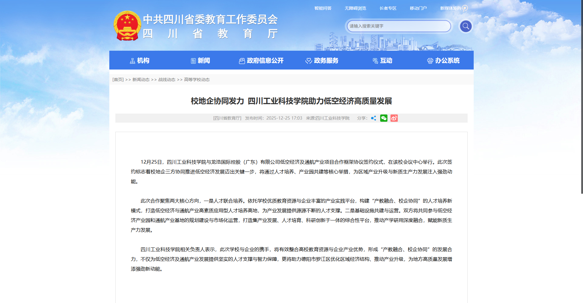 12月25日,四川工业科技学院与龙浩国际控股(广东)有限公司低空经济及通航产业项目合作框架协议签约仪式,在该校会议中心举行。此次签约标志着校地企三方协同推进低空经济发展迈出关键一步,将通过人才培养、产业园共建等核心举措,为区域产业升级与新质生产力发展注入强劲动能。