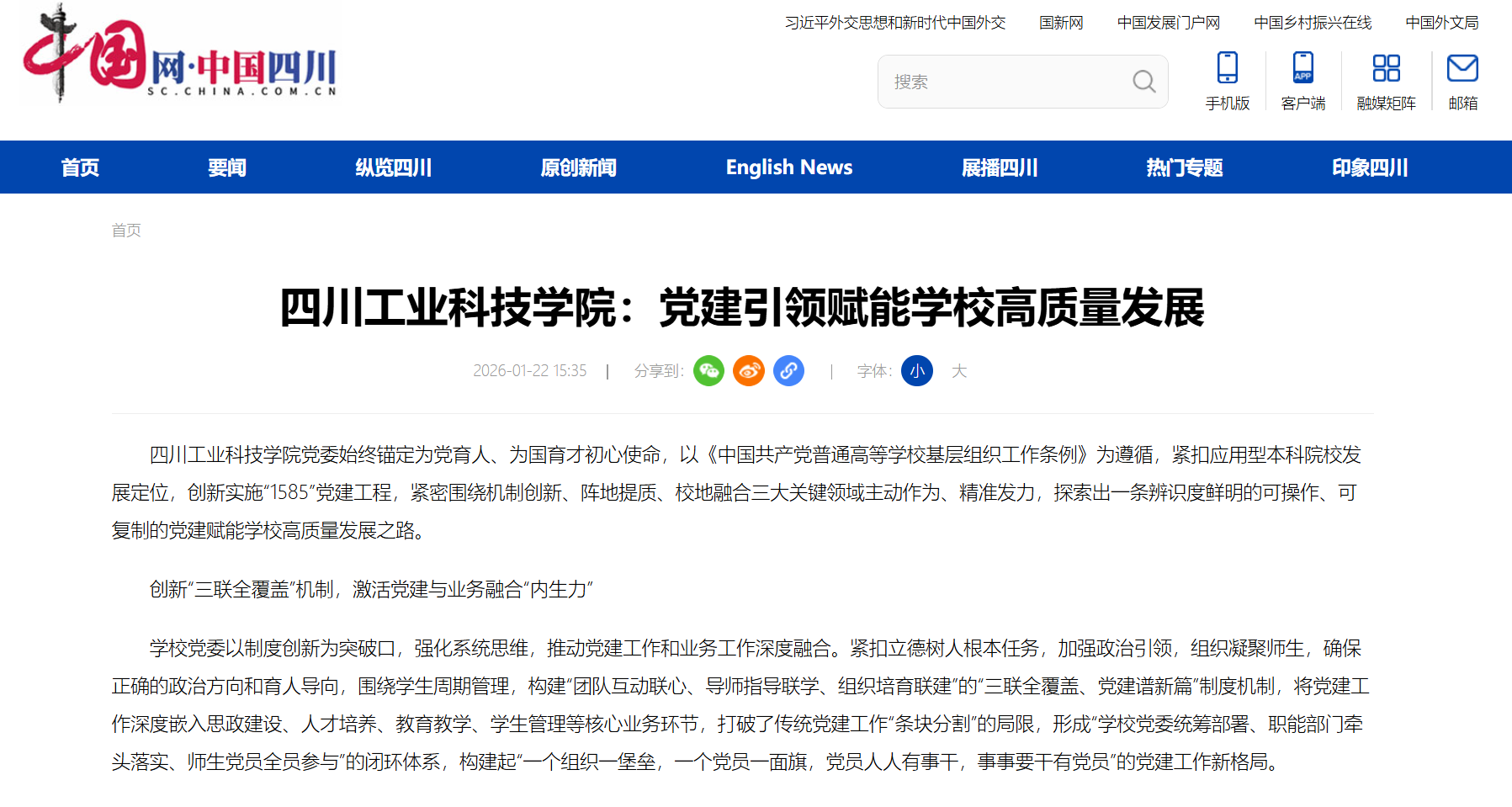 四川工业科技学院党委始终锚定为党育人、为国育才初心使命,以《中国共产党普通高等学校基层组织工作条例》为遵循,紧扣应用型本科院校发展定位,创新实施“1585”党建工程,紧密围绕机制创新、阵地提质、校地融合三大关键领域主动作为、精准发力,探索出一条辨识度鲜明的可操作、可复制的党建赋能学校高质量发展之路。