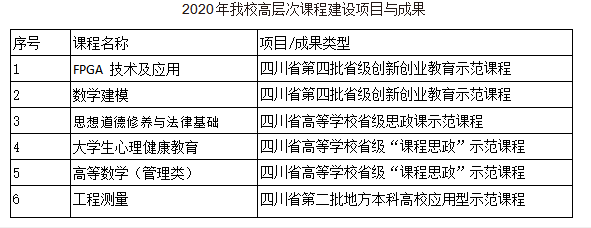 一是课程建设成果丰硕。课程是人才培养的核心要素,是落实立德树人根本任务的具体化、操作化和目标化。我校积极开展课程建设,将课程建设作为教学改革与建设的核心工作。学校相继出台了《课程建设规划(2015-2020年)》、《课程建设管理若干规定》《在线开放课程管理办法》等一系列规章制度作保障,通过建设规范课程、创建优质课程、争创精品课程,促进教学内容与课程体系改革不断深化。2020年,学校课程建设成绩显著,建设校级在线开放课程15门,校级课程思政示范课10门,校级思政课程示范课2门,认定校级精品在线开放课程10门。2门课程入选四川省“课程思政”示范课,1门课程入选四川省“思政课程”示范课,2门课程入选四川省创新创业示范课,1门课程入选四川省应用型本科示范课。
