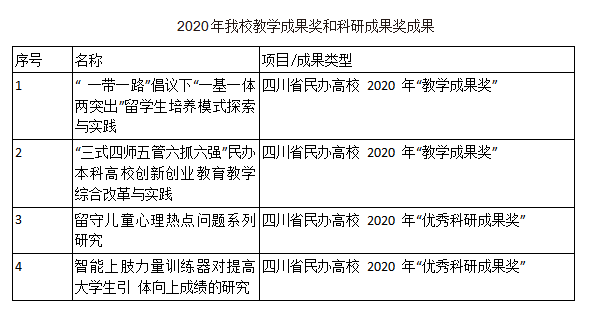 二是教学成果和科研成果获奖再斩新枝。学校重视教学成果和科研成果的建设,凝心聚力,不断进取。2020年学校积极参加由四川省民 办教育协会高等教育专业委员会、四川省民办教育协会研究中心共同牵头组织的四川省民办高校内涵建设项目的评选,我校所推荐2项教学成果奖和2项科研成果奖参选项目,均获得评审专家的认可,填补了我校教学成果奖和科研成果奖在省级项目上的空白。