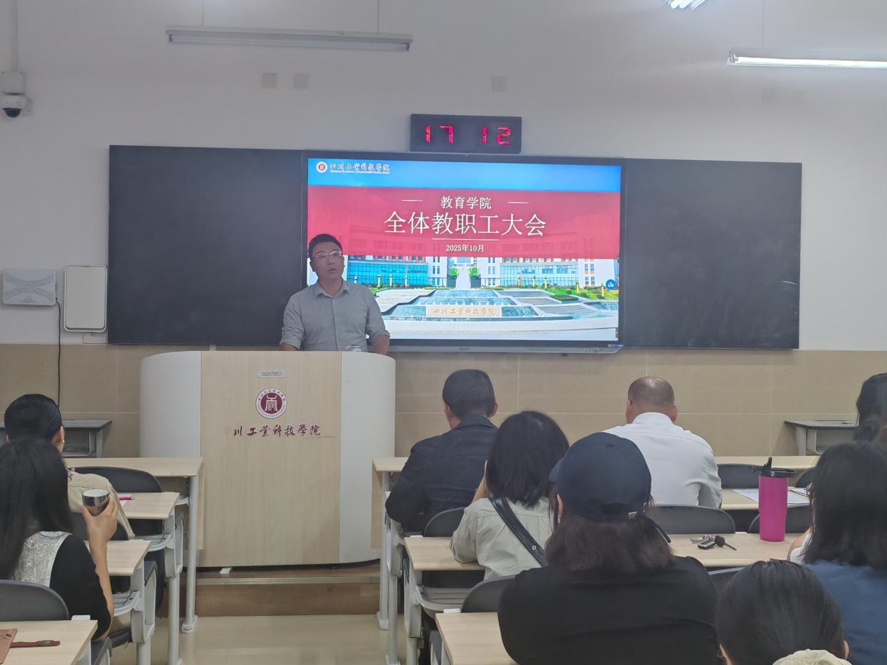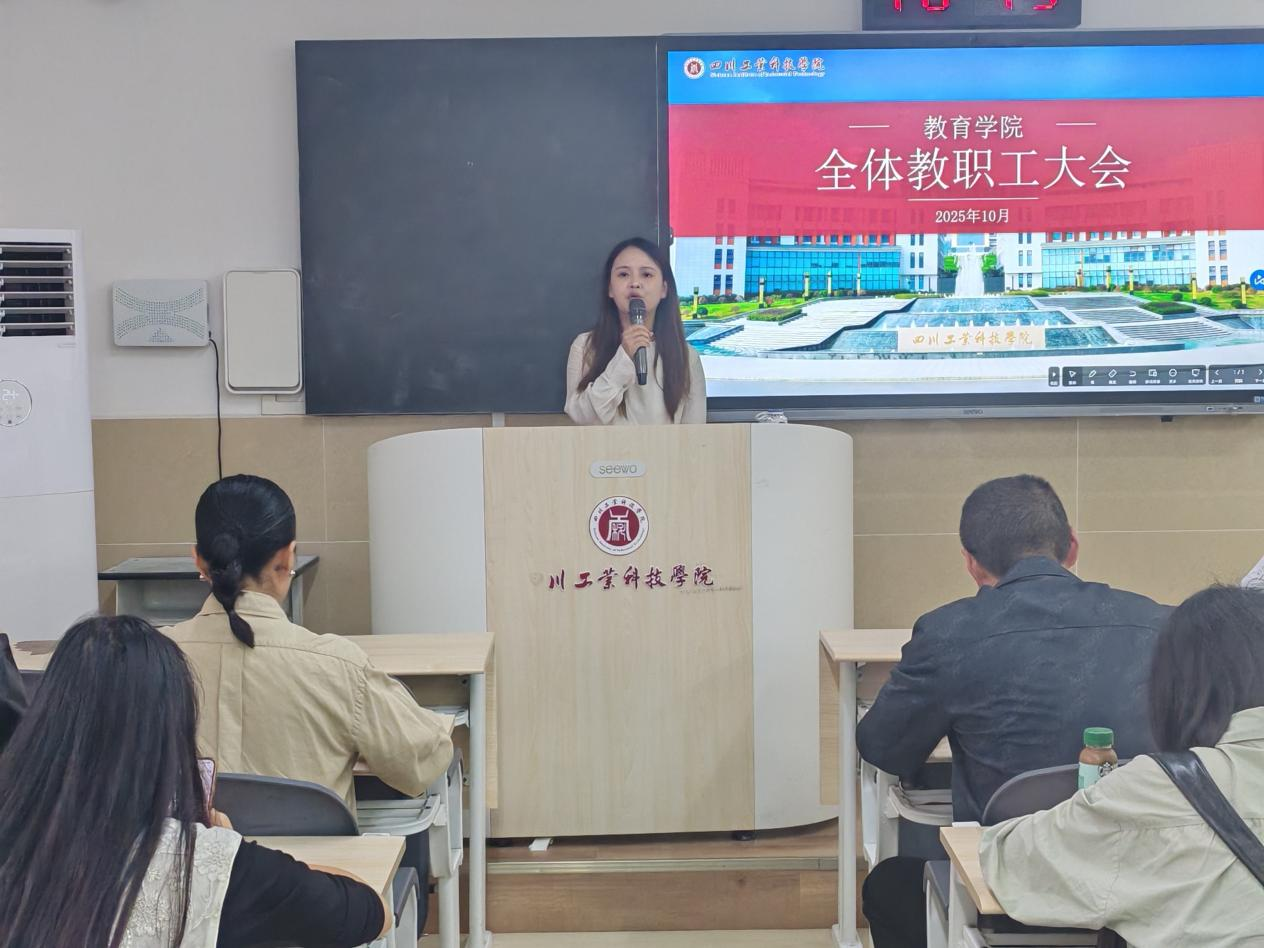 10月16日,教育学院在龑江校区D410教室召开教职工大会,会议由学院综合办副主任周洪婷主持,学院全体教职工积极参会,共同聚焦科研能力提升与意识形态安全建设。