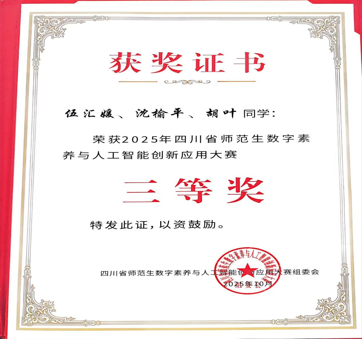 10月25日,四川省师范生数字素养与人工智能创新应用大赛顺利闭幕。经济管理学院学生代表队凭借作品《会计信息系统智能体》,在“AI教育智能体设计与应用”赛道中荣获省级三等奖,展现出优异的跨学科创新与实践能力。