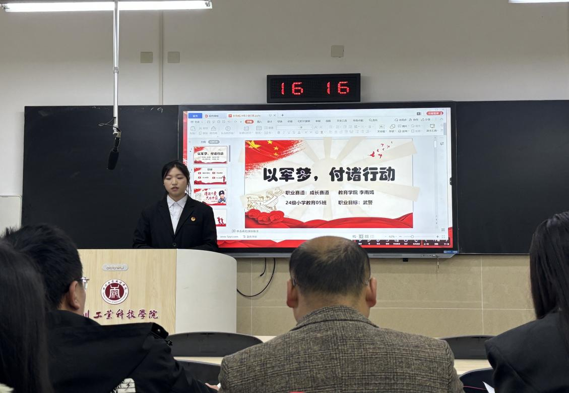 自大赛启动以来,全院学生积极响应、广泛参与。经班级初审、学院复审等多轮选拔,共有16名选手晋级院级决赛。其中,就业赛道9人,分别为何佳、李玉梅、卢凤琳、尹文涵、苟小艳、宋婷、丁旭露、杨雨馨、邱昕怡;成长赛道7人,包括杨又豪、李雨嫣、缑成苗、潘彦如、李思佳、肖磊、陈俊蓉。决赛采用现场路演形式,设置“5分钟PPT展示+3分钟答辩”两个环节,选手需围绕自我认知、职业环境分析、目标设定与实施路径等核心内容,结合教育行业发展趋势与个人专业背景进行综合展示。