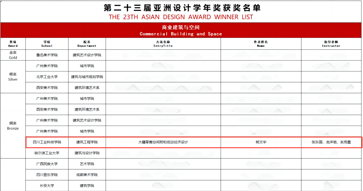 近日,第二十三届亚洲设计学年奖获奖名单正式公布。在“商业建筑与空间”竞赛单元中,学院参赛作品凭借卓越的创新设计与前瞻理念脱颖而出,荣获铜奖。