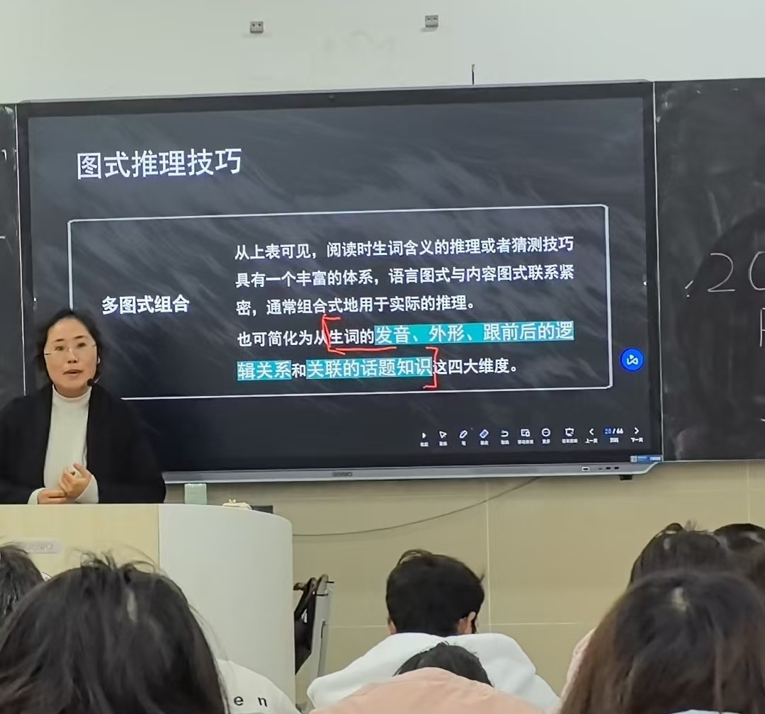 朱玉梅老师围绕“理论奠基、问题聚焦、生词再认、多维推理、策略整合、实践演练”六大模块展开系统讲授。她首先结合认知心理学理论,生动阐释了阅读的认知过程与常见误区,并基于图式理论,深入剖析了学生日常阅读中过度依赖工具、频繁中断查词等影响阅读流畅性与理解深度的实际问题。讲座重点讲解了如何运用语言图式与内容图式协同互补的策略,引导学生通过语音线索、构词规律、上下文逻辑及话题背景等多维度信息,综合推理生词含义。为使理论更好地落地,朱老师精心设计了系列综合演练环节,所选材料涵盖日常对话、经典教材、大学英语四六级真题及全国大学生英语竞赛试题,紧密贴合学生学习与应试实际,生动展示了多维推理策略的实践价值与应用效果。