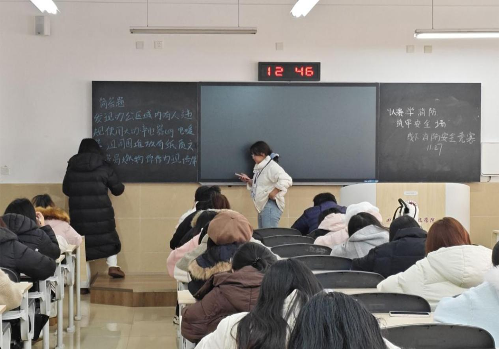 本次竞赛紧密围绕校园消防安全实际,以“全民消防、生命至上——安全用火用电”为主题,聚焦宿舍违规用电、实验室电路隐患等校园常见风险点设计竞赛内容,确保知识学习具有针对性和实用性。赛前,工作人员在考场内精心布置竞赛用品,包括涵盖消防法规、隐患识别的基础单选题,以及涉及逃生步骤、器材参数的专业填空题,营造出严肃而有序的竞赛氛围。参赛学生手持签字笔,神情专注,展现了学院学子积极学习安全知识的良好风貌。