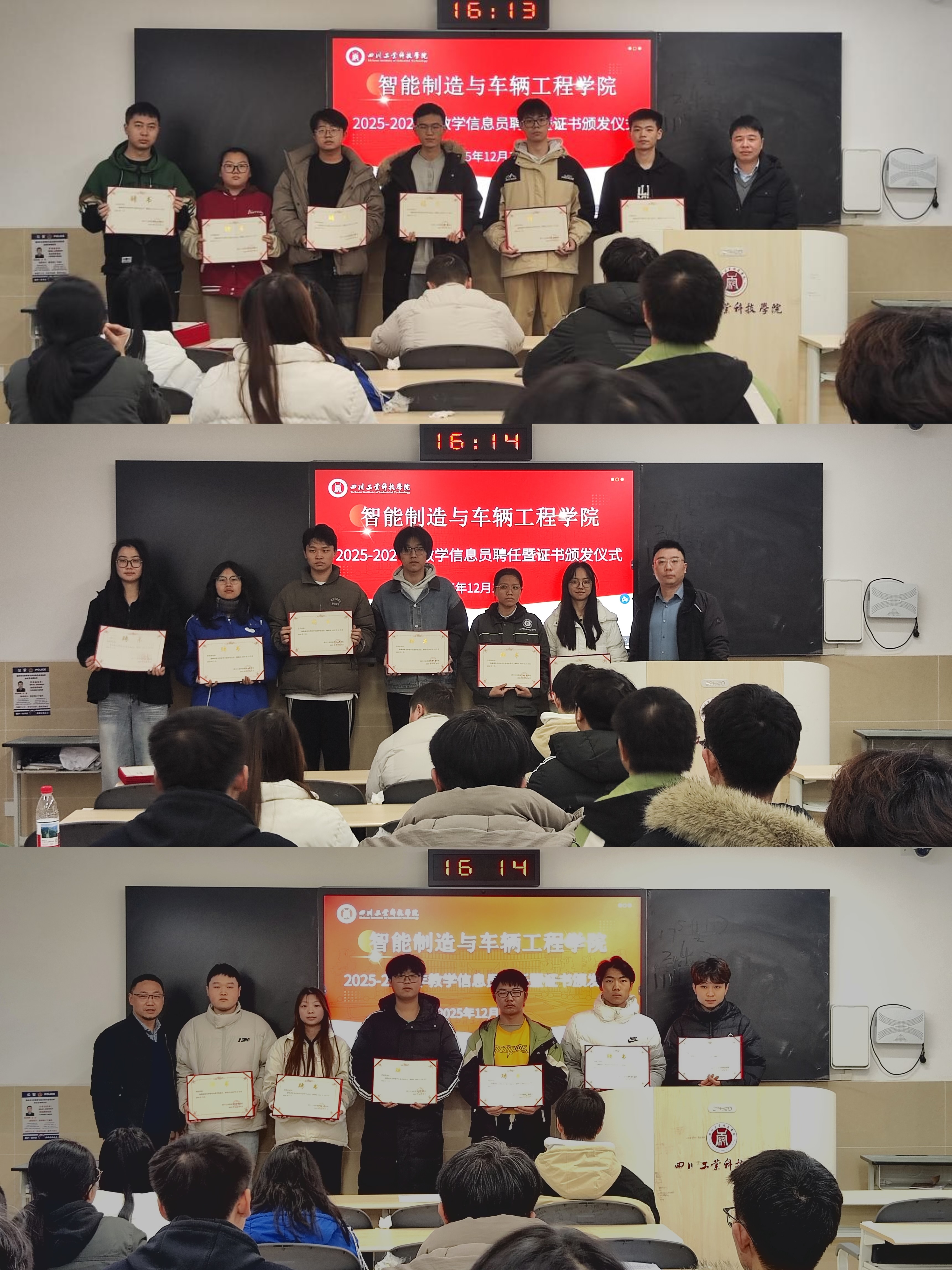 为完善教学质量监控体系并发挥学生在质量管理中的积极作用,智能制造与车辆工程学院近日在龑江C503教室举行了2025-2026学年教学信息员聘任暨证书颁发仪式。