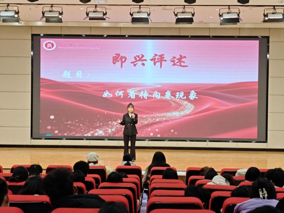 即兴评述环节对选手的临场应变与逻辑思维提出了更高要求。选手需在90秒内,对随机抽取的社会热点话题进行即兴分析与阐述。题目涵盖“国潮崛起除情怀外还依靠什么”“‘脆皮年轻人’是‘自嘲’还是‘真相’”“数字游民的生活是自由还是另一种漂泊”等多个维度,兼具时代性与思辨性。面对挑战,选手们沉着应对、快速构思,以清晰的条理和独到的见解完成了评述,展现出良好的综合素质。