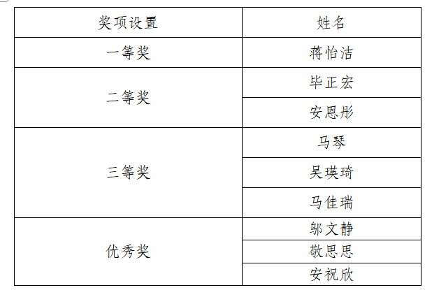 经过激烈角逐与评委团的公正评审,本次校内选拔赛最终评选出一等奖1名、二等奖2名、三等奖3名、优秀奖3名。具体获奖名单如下: