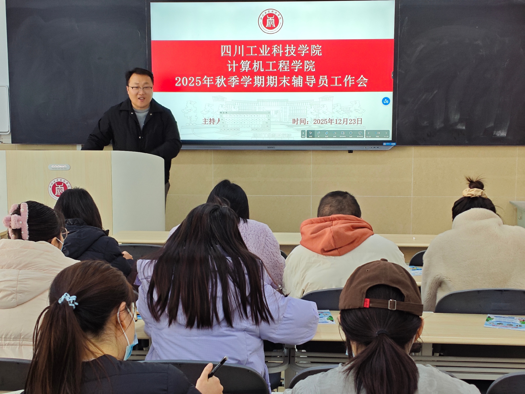 12月23日下午,计算机工程学院在龑江C411会议室召开期末辅导员工作专题会议,旨在统筹推进期末各项学生工作,筑牢校园安全防线。会议由学院党总支副书记张东国主持,全体辅导员参加会议。