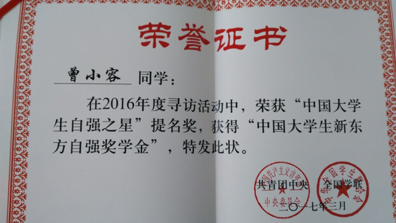 近日,由共青团中央、全国学联主办,中国青年报社、中国高校传媒联盟承办的2016年度寻访“中国大学生自强之星”活动结果揭晓,我校工商管理学院2014级物流管理本科1班曾小容同学荣获“中国大学生自强之星”提名奖,该奖项四川省仅有两名大学生获得。