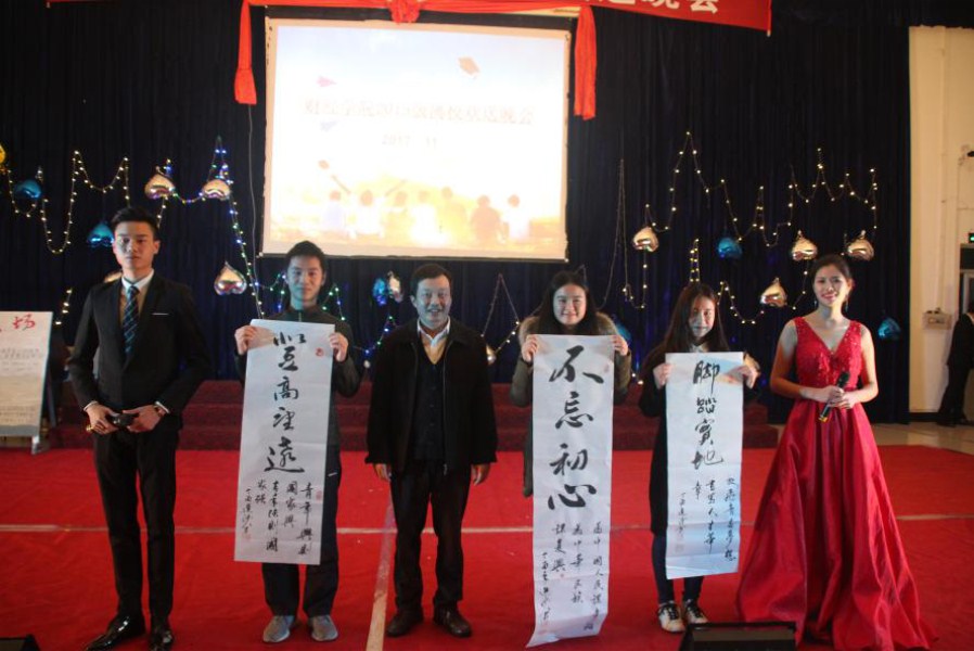 晚会上,张进砂为2018届顶岗离校学生送上墨宝三幅,勉励同学们要“登高望远,不忘初心,脚踏实地”。由全院教职工带来的集体舞蹈《爱的小苹果》,表达了财经学院全体老师的关爱、和祝福的心声,将晚会的气氛推向了高潮。舞蹈《鱼跃生息》突出了莘莘学子们坚韧不拔的精神追求。川剧《变脸》使同学们感受到了中国传统文化的魅力。学生代表的致辞表达了所有学生对未来美好生活的向往。