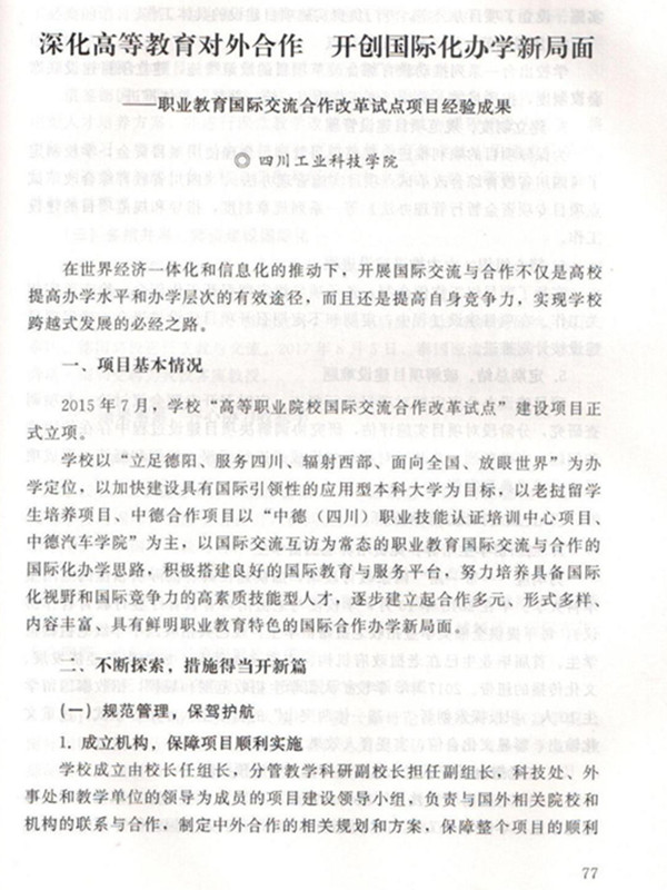 在日前结束的2017年度四川省教育综合改革试点工作推进会议上,我校承担的“职业教育国际交流合作改革试点”项目阶段成果《深化高等教育对外合作 开创国际化办学新局面》入选《四川省教育综合改革试点项目阶段成果集》。