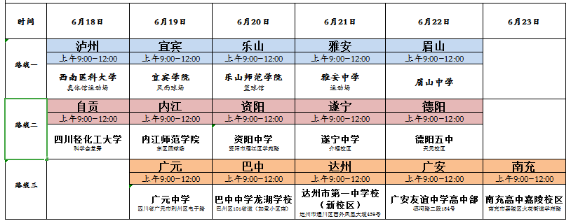 四川省2019年普通高校网上招生咨询会举行时间以四川省招生考试指导中心公布时间为准,现场咨询活动拟定于6月18日至6月23日,共计5天时间,分3条线路,同时在省内相关市州举行。现将各市州咨询会时间及地点通知如下: