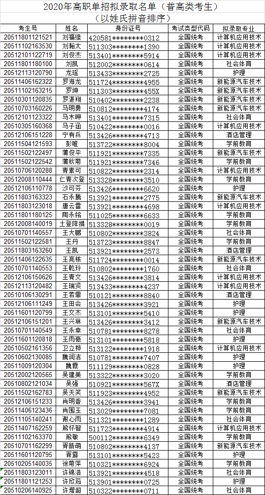 公示时间:6月4日17:00——6月8日17:00。在拟录取名单公示期间,如有自愿放弃单独招生录取资格的考生,须于6月8日12点前将“自愿放弃录取申请书”和本人身份证复印件及联系方式,发送至邮箱35343717@qq.com,否则视为同意我校录取。被我校高职单招录取的考生,将不再参加2020年普通高考及对口高职招生考试。
