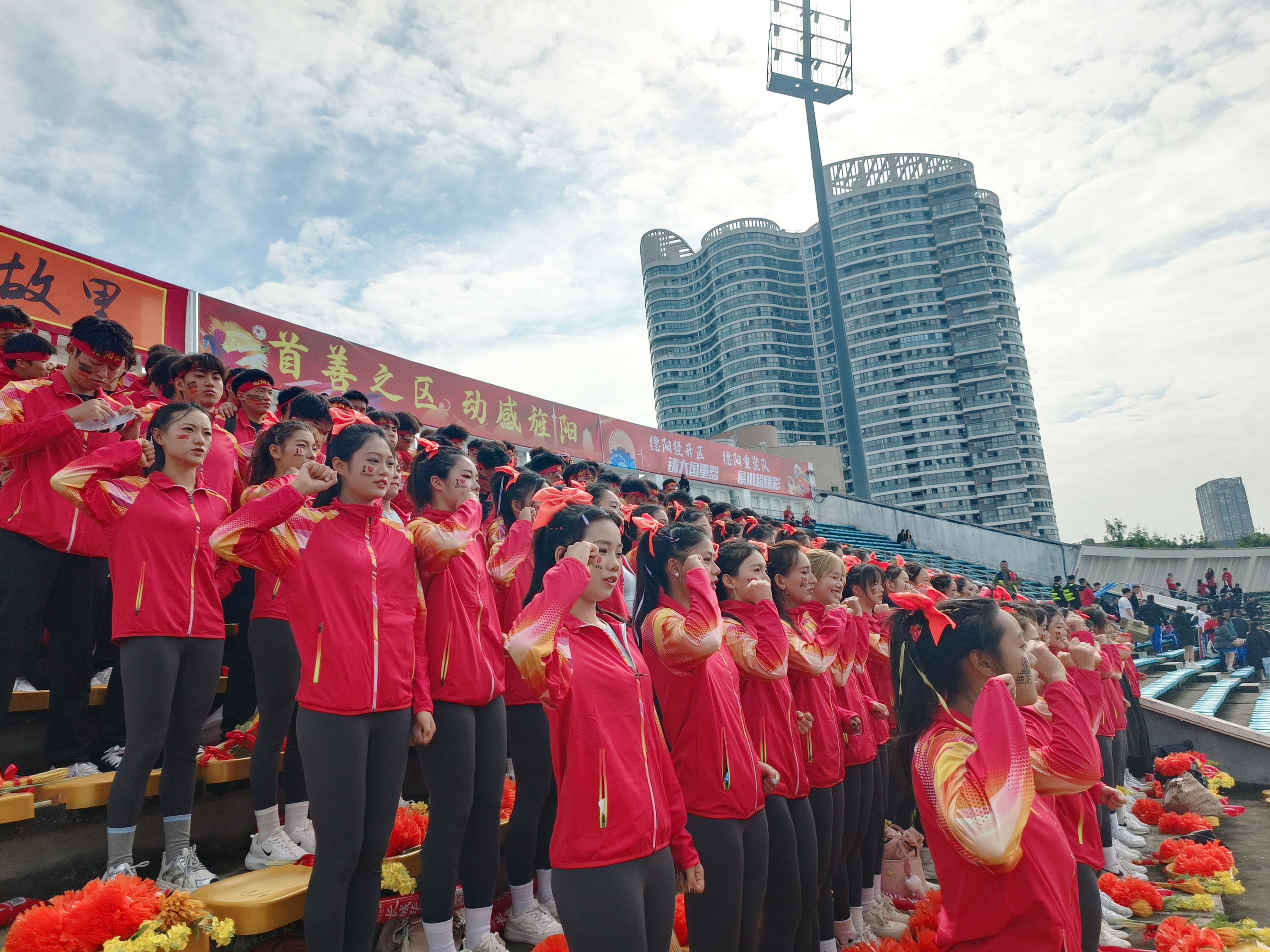 作为本次赛事最具辨识度的助威力量,四川工业科技学院师生团队精心筹备了全流程助威表演。由张彬老师原创的助威歌曲《德阳重装?独领风骚》成为全场亮点,歌曲旋律激昂、歌词彰显德阳城市特色;由80名男生组成的战舞方阵,以刚劲有力的动作配合震撼鼓声,演绎出节奏感十足的手势舞,每一个动作都饱含力量与激情,展现出青春昂扬的精神风貌;而80名女生则带来三种不同风格的啦啦操表演,或灵动活泼、或舒展大气、或活力四射,凭借精湛的编排与默契的配合,成为德阳各区县啦啦队中气势最盛、风格最突出的队伍,为紧张的赛事增添了柔美与灵动。