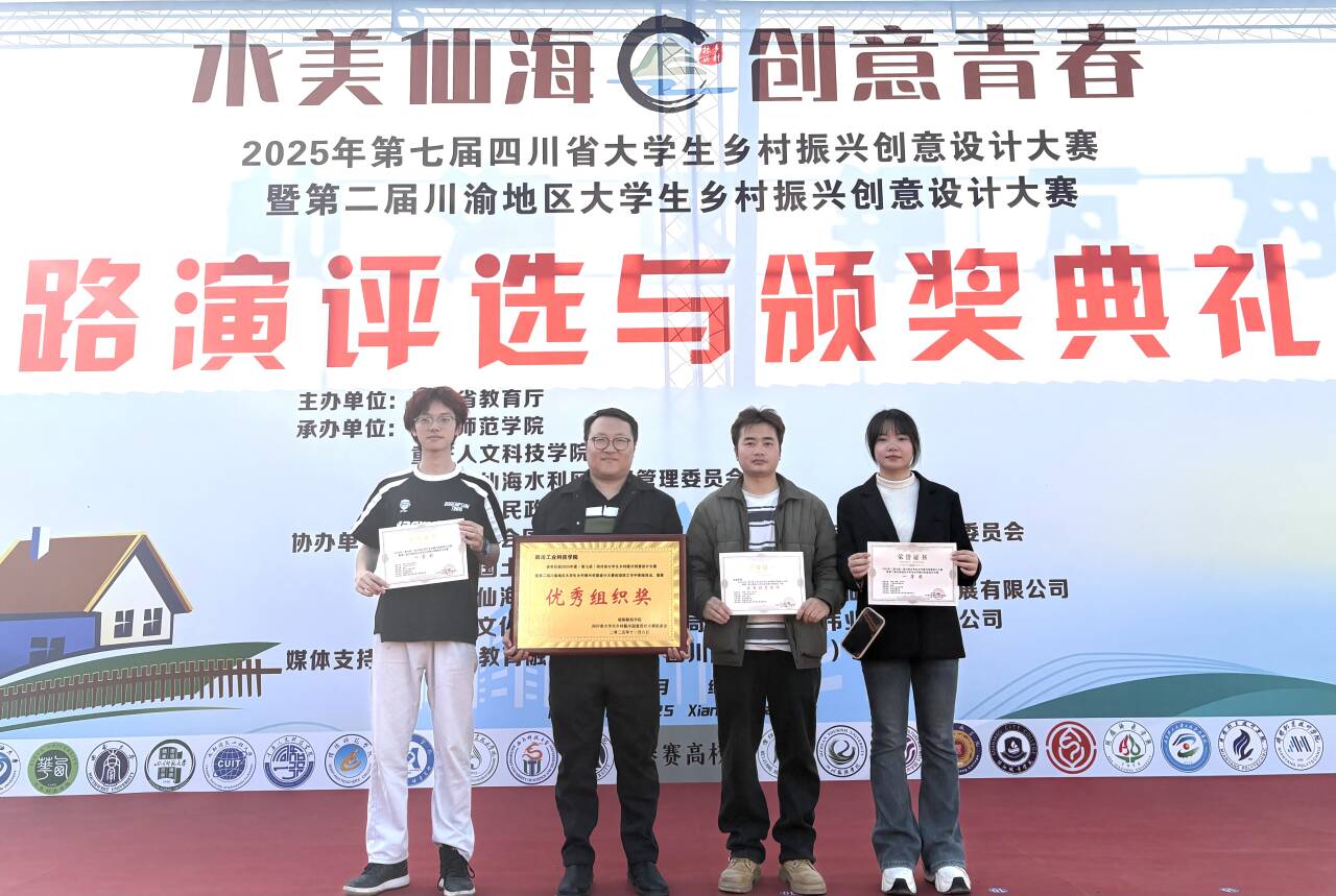 11月8日,2025年(第七届)四川省大学生乡村振兴创意设计大赛暨川渝第二届大学生乡村振兴创意设计大赛路演评选与颁奖活动在绵阳市游仙区仙海景区铜瓦村顺利举行。学校信息工程学院学子凭借扎实的专业素养与卓越的创新设计能力,在51所高校的1248支参赛团队中脱颖而出,共荣获一等奖1项、二等奖6项、三等奖9项,学校同时获评大赛“优秀组织奖”。
