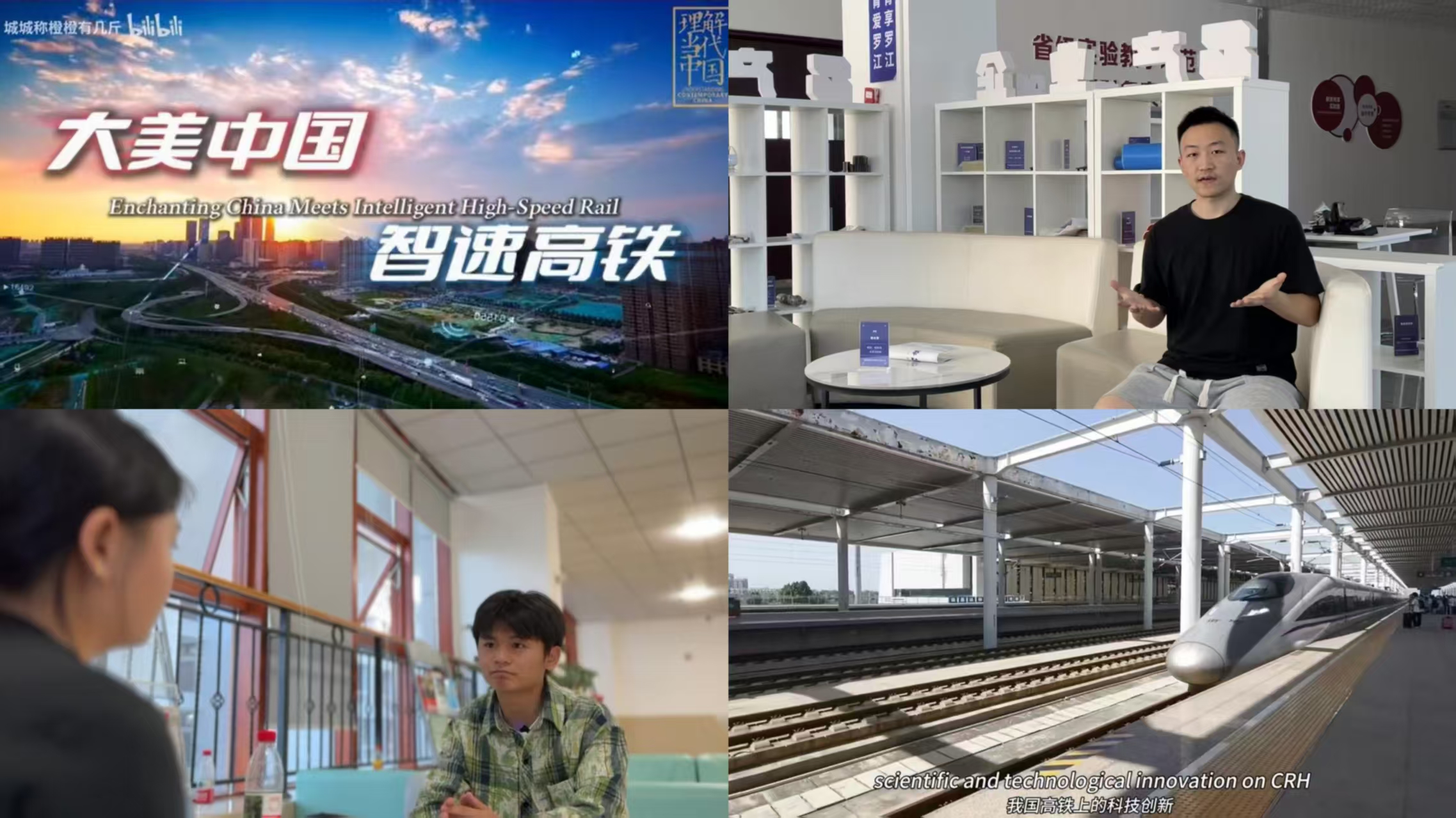 图2:英语短视频赛项金奖团队作品《大美中国·智速高铁》拍摄场景及主创成员