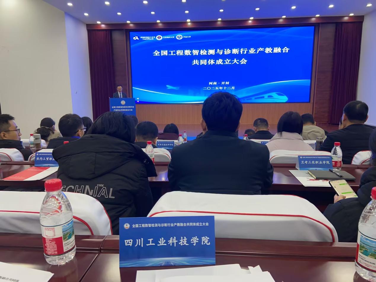 近日,全国工程数智检测与诊断行业产教融合共同体成立大会在河南开封大学举行。学校凭借在智能制造与数字化技术应用领域的扎实积累,被推选为副理事长单位。信息工程学院教师代表学校出席本次大会,并全程参与共同体章程审议、组织架构搭建等重要议程。