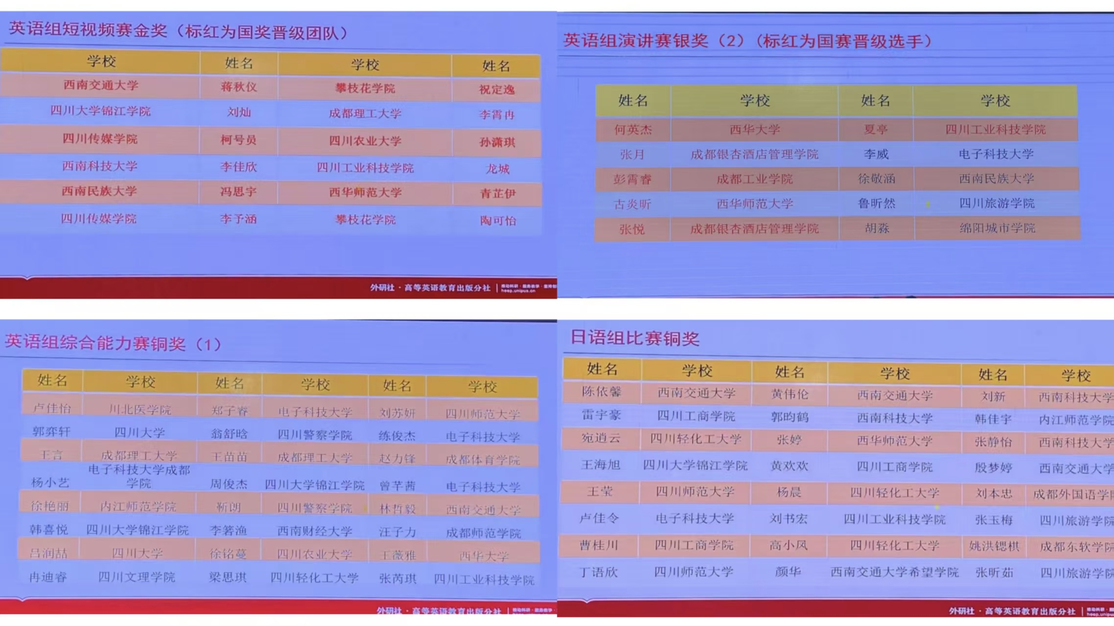 同时,2025“外研社·国才杯”“理解当代中国”四川省大学生外语能力大赛在成都理工大学圆满落幕。学校学子在英语短视频、英语演讲、英语综合能力、英语笔译和日语综合能力五个赛项中表现优异,共斩获金奖一项、银奖一项、铜奖两项,并有两位选手顺利晋级全国决赛,创下学校在该项赛事中的历史最佳成绩。