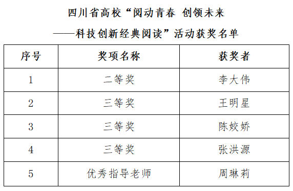 在第八届“悦读新时代”四川高校阅读文化节系列活动中,我校积极组织读者参与并取得了优异成绩。现将获奖师生名单公布如下: